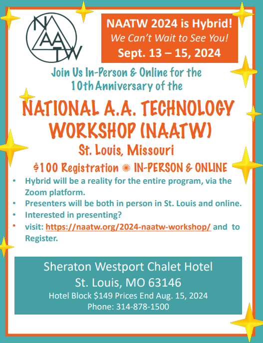 The Workshop is an annual event where those interested in using technology in service to Alcoholics Anonymous gather to share experience. It provides a place to share ideas, connect with other A.A.s interested in technology, and bring these ideas back to our respective local areas. Sessions are suggested and presented by our members who submit ideas for sessions.