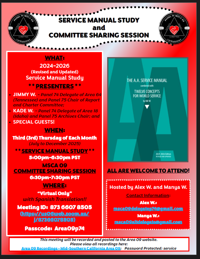 *This meeting will be recorded and posted to the Area 09 website. Please view all recordings here: Area 09 Recordings – Mid-Southern California Area 09; Password Protected: service