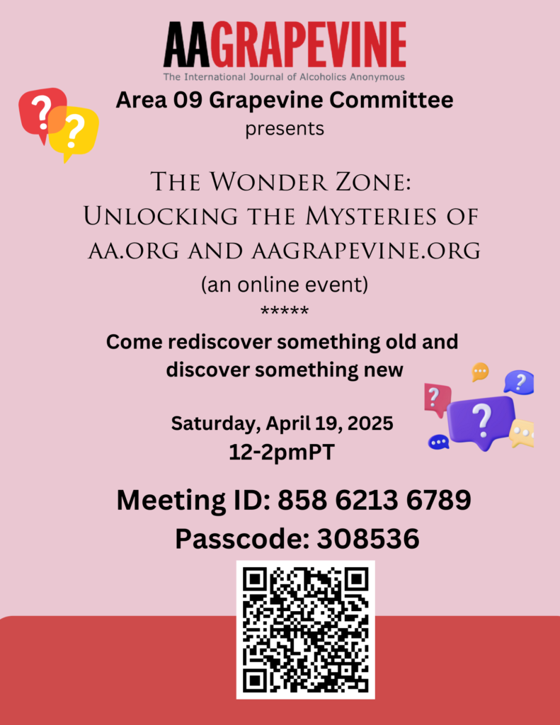 - Francine W., Area Grapevine Chair, will join us via Zoom, who will share details about an upcoming Grapevine event discussing the Grapevine and all that is going on with this important tool for recovery. Flyer attached, please share!
